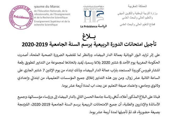 تأجيل امتحانات الدورة الربيعية بجامعة الحسن الثاني بالدار البيضاء