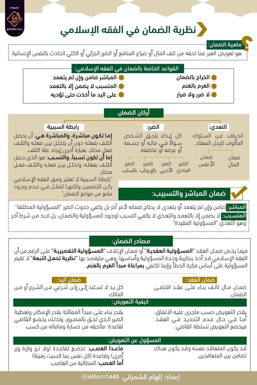 مختارات عدلية Ar Twitter الضمان في الفقه الإسلامي تعريفه القواعد الخاصة به في الفقه الاسلامي أركان الضمان ضمان المباشر والتسبيب مصادر الضمان كيفية التعويض