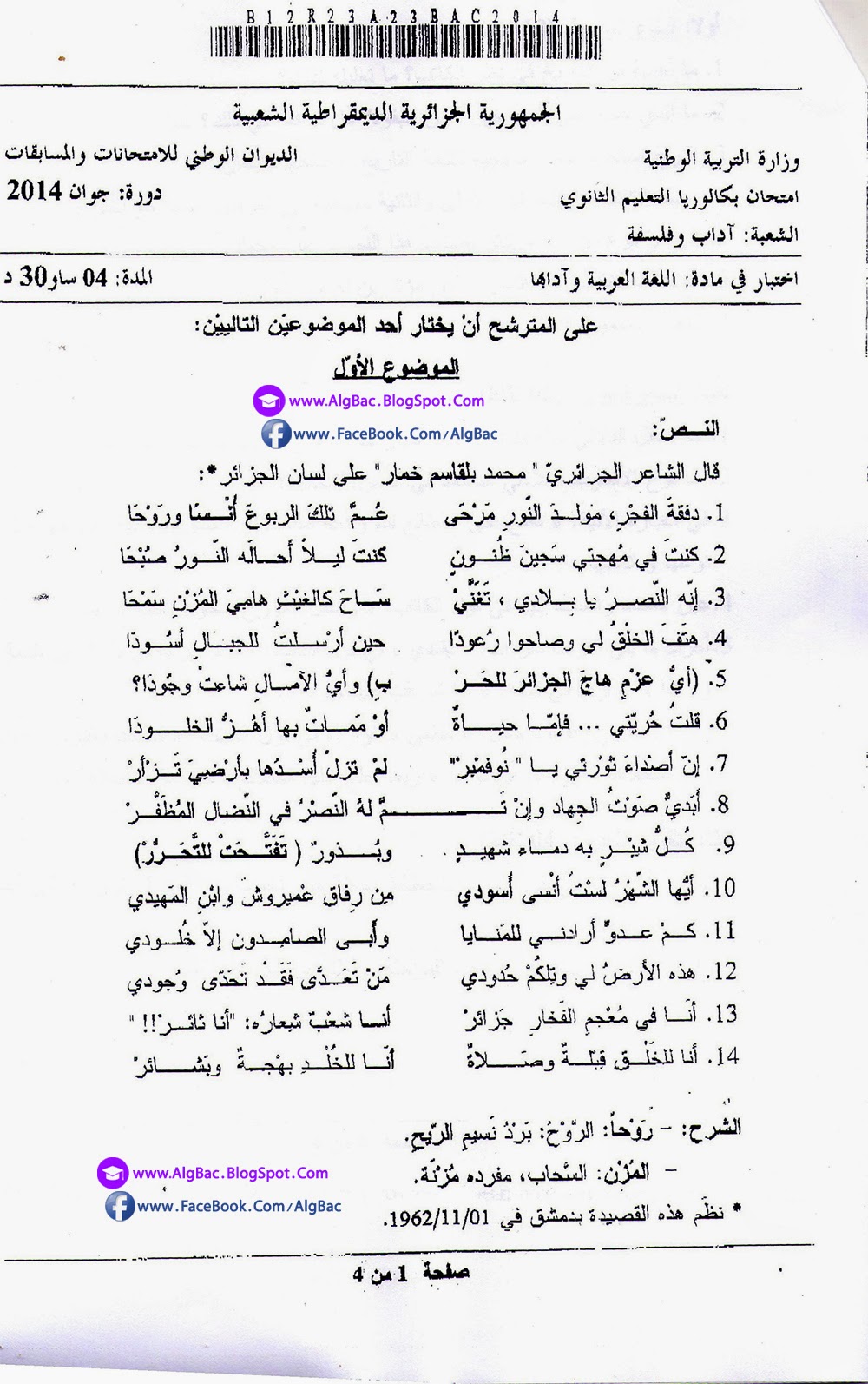 مواضيع اللغة العربية شعبة اداب و فلسفة بكالوريا 2014