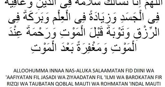 ا لله م ا ن ا ن س أ ل ك س لا م ة ف ى الد ي ن و ع اف ي ة ف ى ال ج س د و ز ي اد ة ف ى ال ع ل م و ب ر ك ة ف ى الر ز ق و ت و ب ة ق ب ل ال م و ت و ر ح م ة ع ن د ال م و ت و م غ ف ر ة ب ع د ال م و ت
