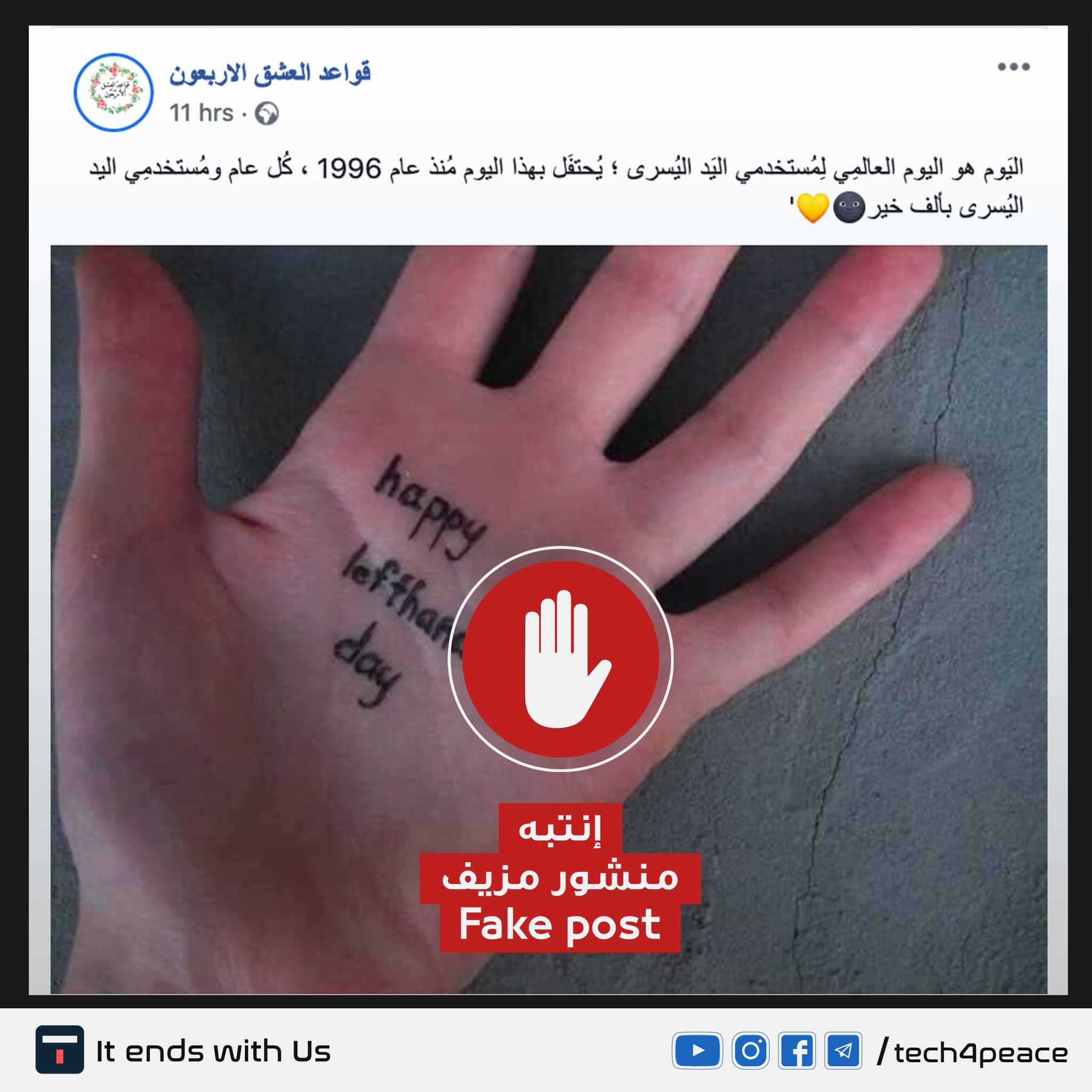 Tech 4 Peace التقنية من اجل السلام On Twitter صفحات لديها ملايين المتابعين تنشر خبر مزيف نصه الي وم هو اليوم العالم ي ل م ستخدمي الي د الي سرى ي حتف ل بهذا اليوم م نذ عام 1996 ك ل