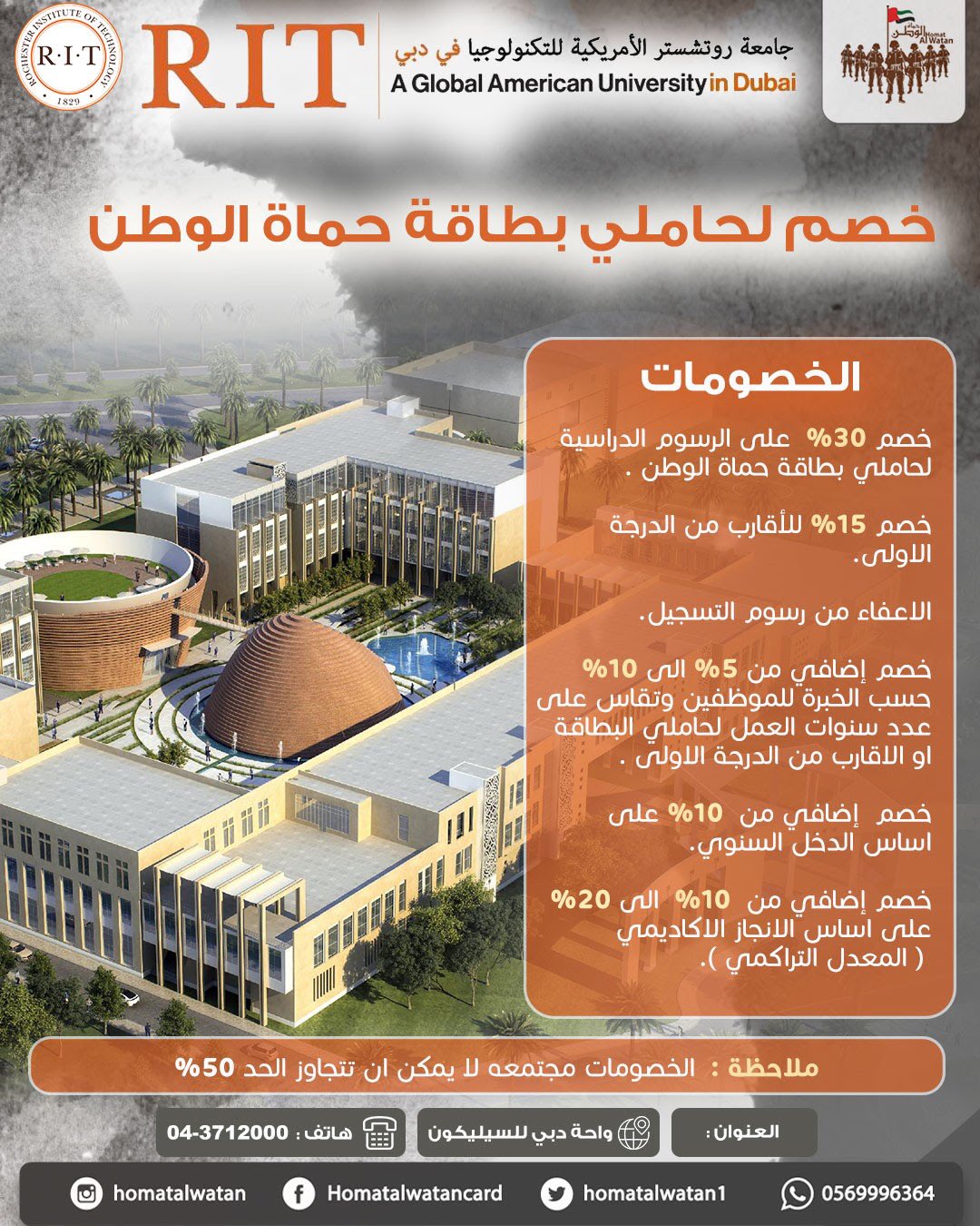 Uzivatel حماة الوطن Na Twitteru عرض خاص و حصري لحاملي بطاقة حماة الوطن من جـامعــة روتشستر الأمريكيــة للتكنولوجيــا فـي دبي العرض خصم 30 على الرسوم الدراسية لحاملي بطاقة حماة
